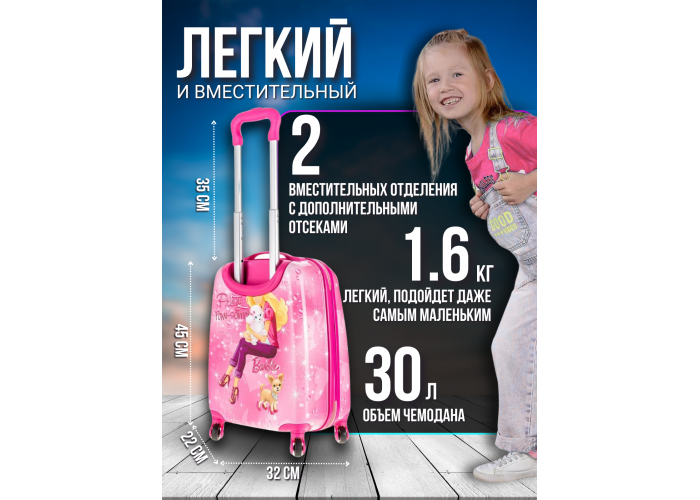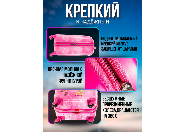 Детский чемодан на 4 маневренных колесиках из практичного пластика. Нежного голубого цвета. Чтобы убедиться, что товар дойдет до покупателя без царапин и внешних повреждений, производители покрывают чемоданы прозрачной матовой защитной пленкой. По этой причине новые чемоданы выглядят недостаточно яркими. Однако после снятия защитной пленки, Ваш чемодан преобразится.