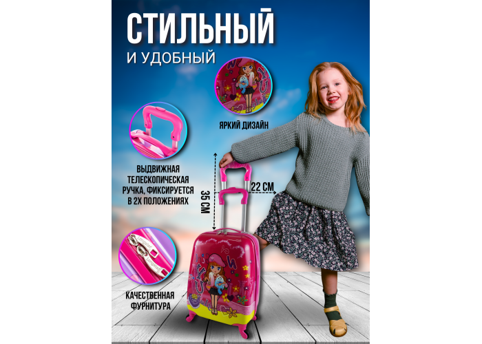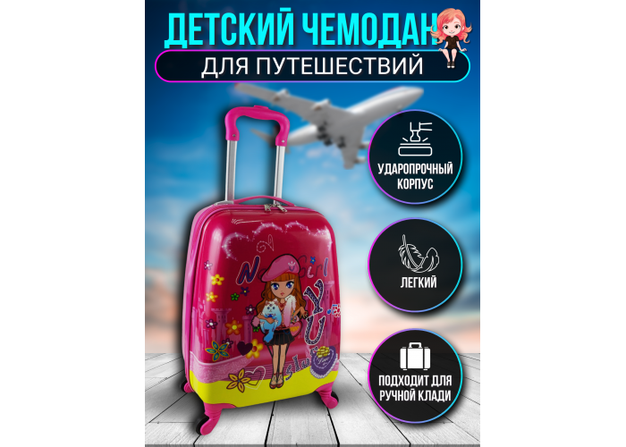 Легкий, вместительный детский чемодан для маленьких путешественников с ярким принтом. Размер данного чемодана подходит для путешествия выходного дня или в качестве ручной клади в большинстве авиакомпаний. Чемодан выполнен из прочного пластика и оснащен полиуретановыми колесами, вращающимися на 360 градусов, что позволяет катить чемодан по любой поверхности, не нагружая руку. Оснащен ручкой для переноски, а также алюминиевой выдвижной ручкой, которая для вашего удобства может фиксироваться в 2 положениях. Модель застегивается на молнию. Продуманная внутренняя организация: внутри два отделения, в одном из отделений вещи фиксируются при помощи ремней-резинок, другое отделение имеет вместительный карман для вещей.
