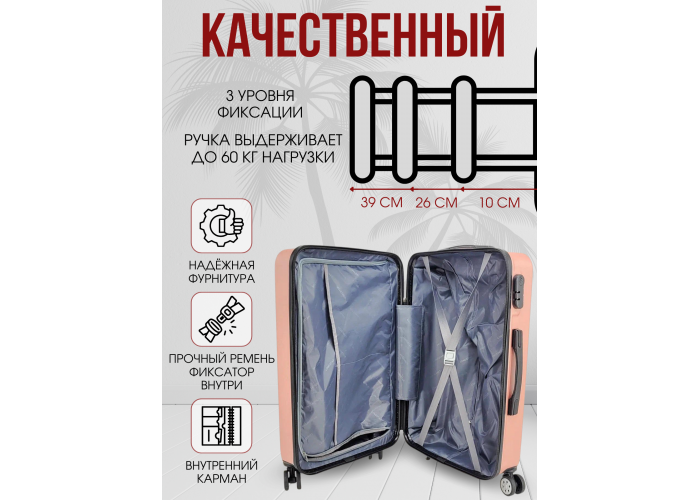 Чемодан оснащен удобной телескопической ручкой с 2-я уровнями фиксации для перемещения чемодана с помощью 4 двойных колес с поворотами на 360 градусов. Для открытия и закрытия выдвижной (телескопической) ручки нужно нажать на кнопку ее блокировки, а затем потянуть ее вверх или вниз. Так же с верхней стороны имеются дополнительная ручка для переноски.